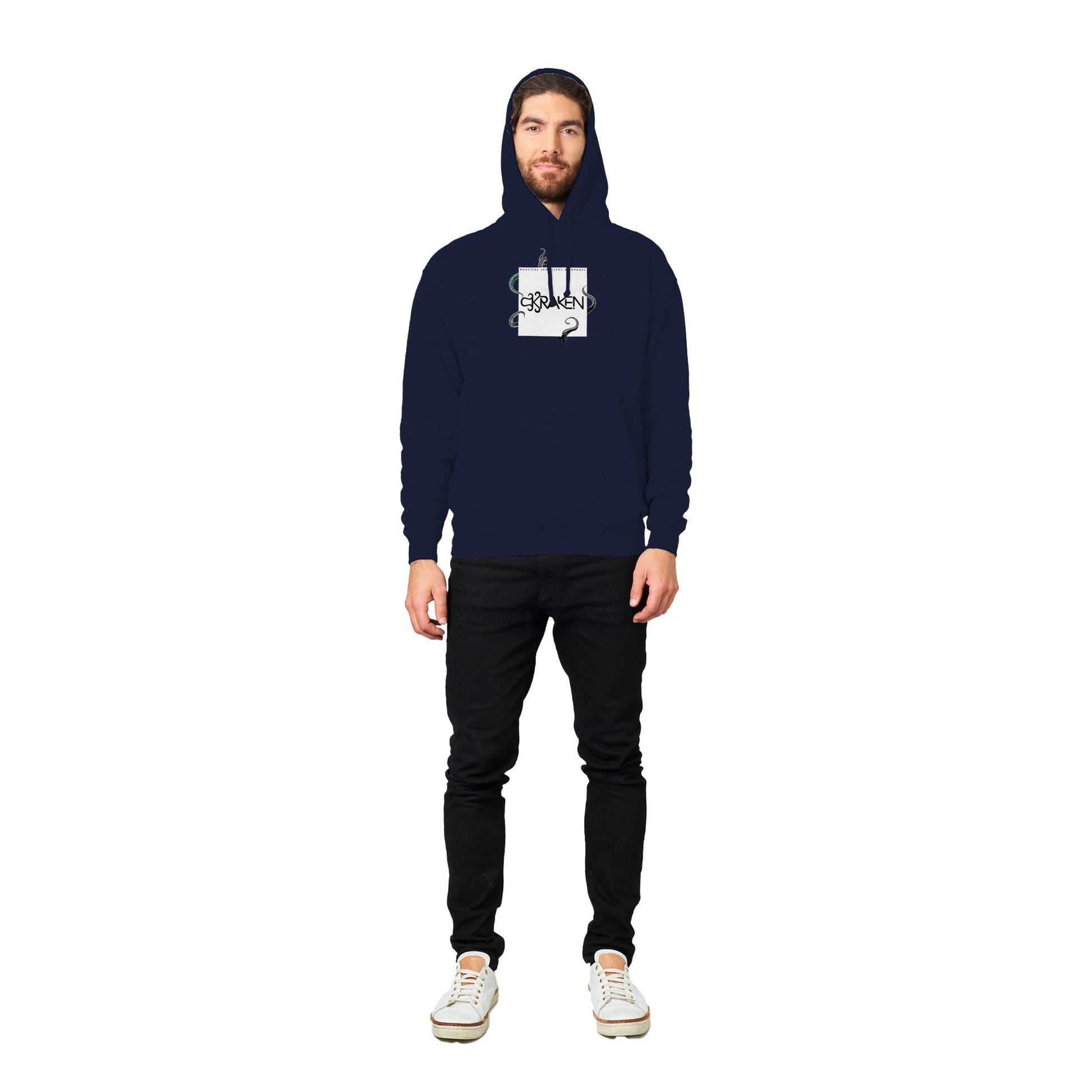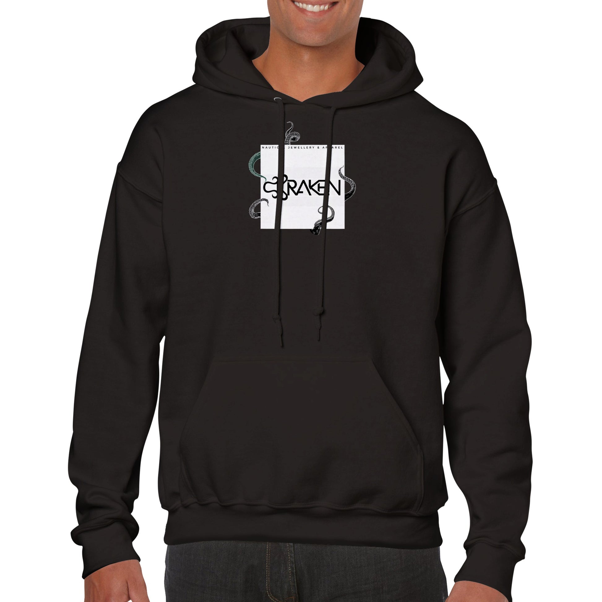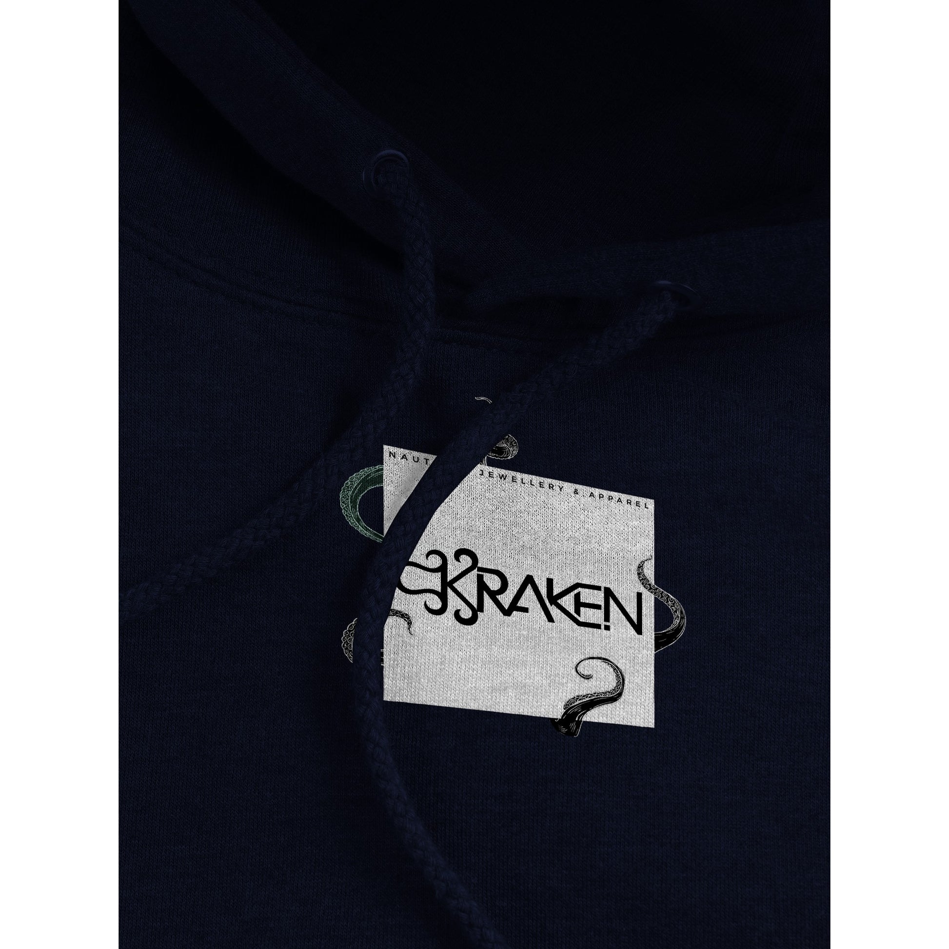 Represent our small nautical brand with a premium hoodie featuring our signiture kraken Logo hiding something beneath.